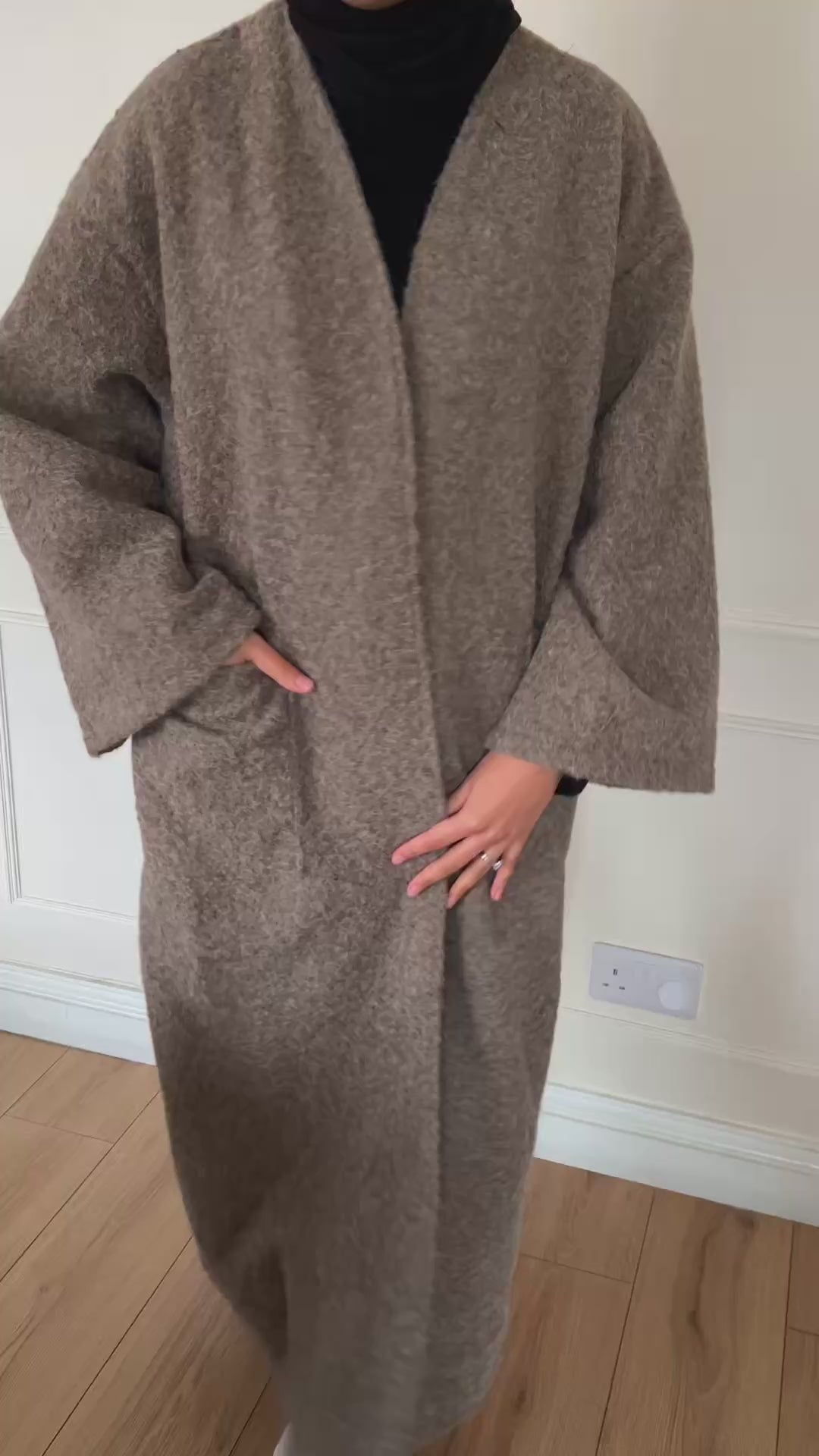 Designed with a soft textured outer layer and a flowy inner lining for a modest yet stylish look. Perfect for layering, offering both comfort and sophistication. Two outside pockets.