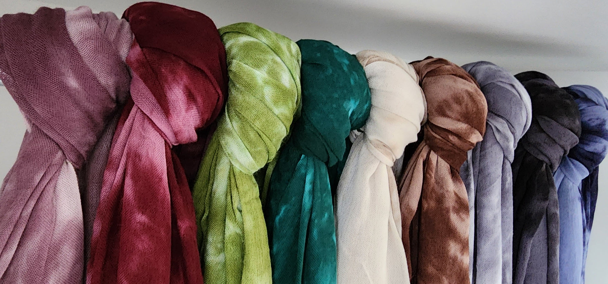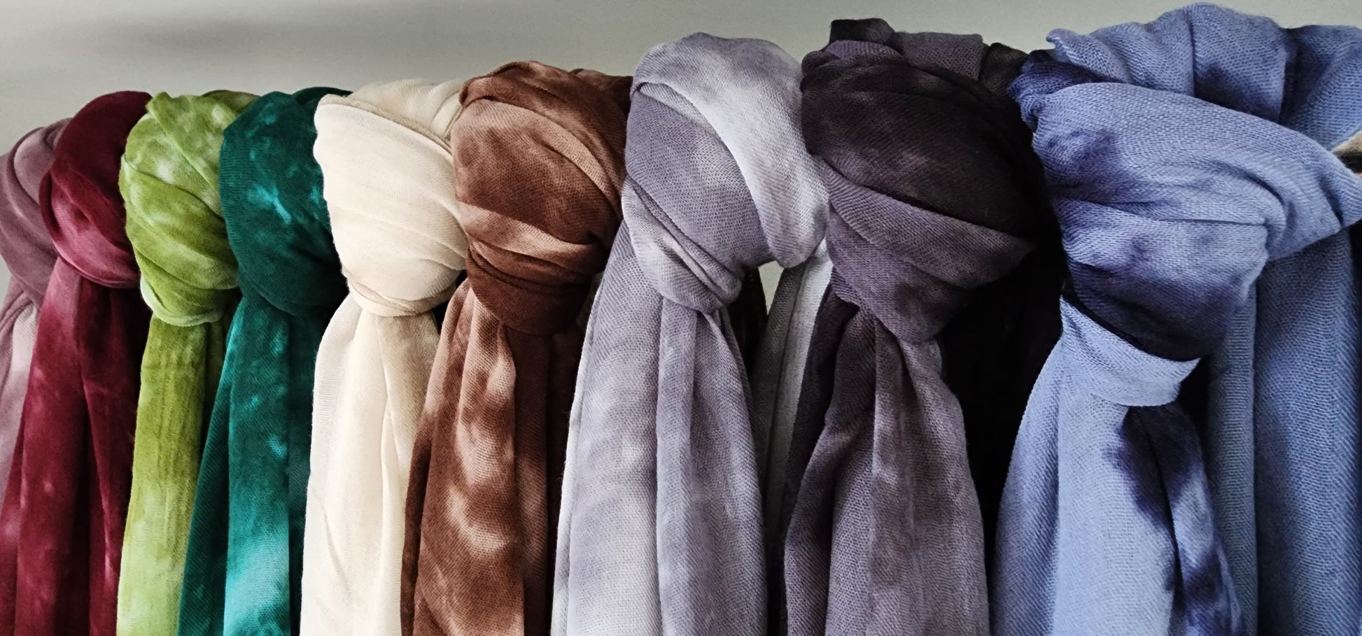 Our personalized tie-dye modal scarves are lightweight with a buttery-soft touch. Casual and smart everyday wear. The tie-dye scarves are made from 100% modal with measurements of 180 cm by 90 cm, offering generous coverage for versatile styling with fringe finishing. This beautiful design comes in 9 different colour combinations.